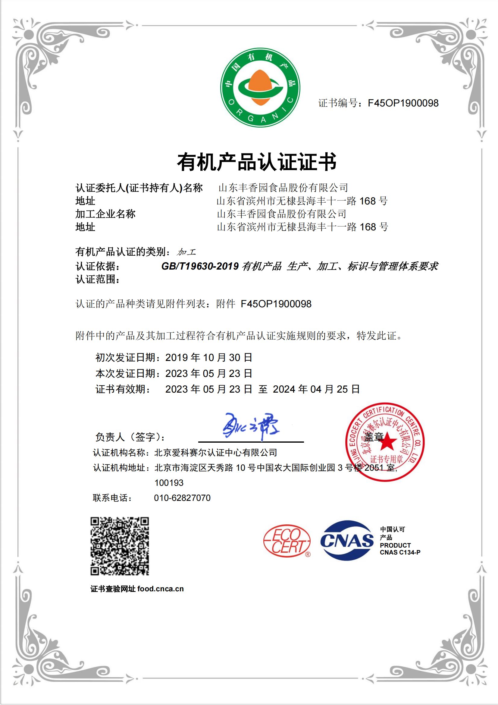 公司獲得HACCP國際質(zhì)量體系認(rèn)證、ISO9001:2015質(zhì)量管理體系認(rèn)證,產(chǎn)品獲得美國FDA認(rèn)證、美國、歐盟有機(jī)食品認(rèn)證、英國BRC體系認(rèn)證、A級(jí)綠色食品認(rèn)證、GB國標(biāo)有機(jī)食品認(rèn)證。